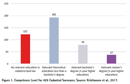 In a survey of competence within municipal cadastral surveying in 2017, it was found that 18% of the responding surveyors did not have relevant education and a further 45% of cadastral surveyors had less than a bachelor’s degree (Kristiansen et al., 2017, p. 46–50). The survey included 429 respondents from 232 municipalities (out of a total of 426 municipalities in Norway in 2017). The survey showed that the dominant providers of education for cadastral surveyors are the Western Norway University of Applied Sciences in Bergen, the Norwegian University of Life Sciences in Ås, and the Norwegian University of Science and Technology in Gjøvik.