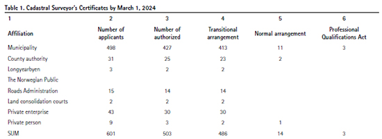 The Norwegian Mapping Authority began authorizing cadastral surveyors on January 1, 2021. Table 1 below shows the status of applications and the awarding of surveyor’s certificates by March 1, 2024. The overview has been prepared by the Norwegian Mapping Authority.