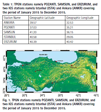 The paper presents ionospheric TEC variation using the GNSS data from the Turkish Permanent GNSS Network (TPGN) including the Turkish IGS stations. TPGN is a huge GNSS network of Turkey containing around 150 stations across all over Turkey. This study includes three TPGN stations namely POZANTI, SAMSUN, and ERZURUM, and two IGS stations namely Ankara (ANKR) and Istanbul (ISTA) from January 2015 to December 2015 (Fig. 1, Table 1). The TPGN data has been accessed from the TUSAGA-Aktif website (https://www.tkgm.gov. tr/tr/ icerik/tusaga-aktif-0) and while IGS data was downloaded from the CDDIS website (ftp://cddis.gsfc.nasa.gov/).