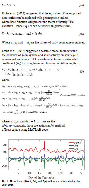 Although the studies based on the above discussion enhance the utility of ionospheric variations. However, to understand the relative contribution of neutral winds, neutral temperature, neural electric field, and neural density periodicities on the ionosphere, further developments, more simulated models, and additional data are required. The ionospheric region which lies between 50 and 1000 km above the earth’s surface includes the mesosphere (50–85 km), the thermosphere (100–690 km), and the partial part of the Exosphere (690–10,000 km). Since during the estimation of TEC, it is assumed that the ionosphere to be a thin shell and located at 350 km altitude above the Earth, hence in the current study, we investigated the geomagnetic activity and its relationship with tropospheric wind speed in the mesospheric and thermosspheric regions of Turkey. The new findings of the study introduce a solar-terrestrial relation that yields in the ionosphere. We used GNSS data from five GNSS stations across Turkey covering the one year of January 2015 to December 2015. First, the relation between GNSS TEC including geomagnetic indices with tropospheric wind speed was presented. A small description of data collection and utilized geomagnetic indices has been given in Section 2. In the next step observed TEC was modeled by using the EOF method and their comparison result is presented. A summary of the proposed EOF method can be seen in Section 3. Later this EOF modeled TEC again compared with the tropospheric wind speed and the obtained results are explained. The result and discussion of the whole study have been presented in Section 3. The conclusion and future of the study have been written in Section 4.