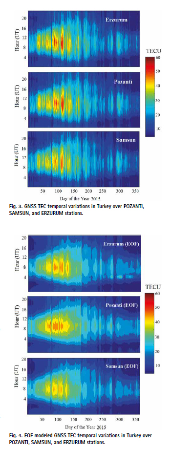 This is clear from Eq. (3), if we take one geomagnetic index analysis, we need to handle 10 constant coefficients, and if we take two geomagnetic indices, there will be 15 constants, that need to be handled. To avoid a more complex analysis, we selected three basic indices (F10.7, Dst, and Ap) and estimated 20 constant coefficients by using the least square method. There are several studies already done, that used these three indices only in their EOF analysis (Dabbakuti et al., 2016; Jamjareegulgarn et al., 2020). In the current analysis, we used these three basic indices (F10.7, Dst, and Ap) as described in Fig. 2 and predicted EOF TEC values at stations i.e., Ankara, Erzurum, Istanbul, and Pozanti (Fig. 4). Here it is difficult to compare Fig. 4 with the corresponding GPS TEC of Fig. 3 in the first view, as they do not exhibit the same kind of variation. Hence, the EOF TEC values are used to do a comparative analysis with the observed GNSS TEC values by using the correlation coefficient and RMSE as shown in Table 2. It is valuable to note that the correlation coefficient of observed GNSS TEC values with EOF TEC values are 0.8020 at Ankara, 0.8287 at Erzurum, 0.9199 at Istanbul, 0.9380 at Pozanti, and similarly 0.9394 at Samsun sites (Table 2). The result shows that the correlation coefficients have different values at each station. This type of variation is nothing but because of some data issues. Some station data variations were affected badly due to any physical cause, hence the performance of the EOF method could not become proper. In the next step, we estimated RMSE between observed TEC and EOF TEC values as shown in Table 2. This is clear from the Table that the RMSE varies from 3.1665 TECU (Samsun) to 4.4220 TECU. These values are very low with a small variation at each station. The station which has a high correlation shows low RMSE and the station which has a low correlation shows high RMSE. In conclusion, it can be said that the EOF model performs quite well and can present the model TEC variations perfectly.