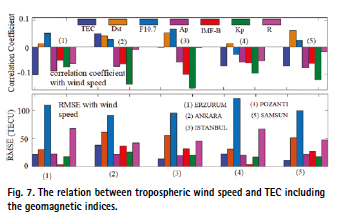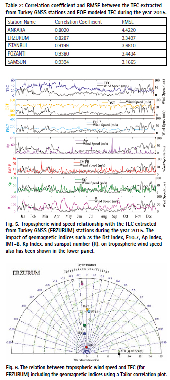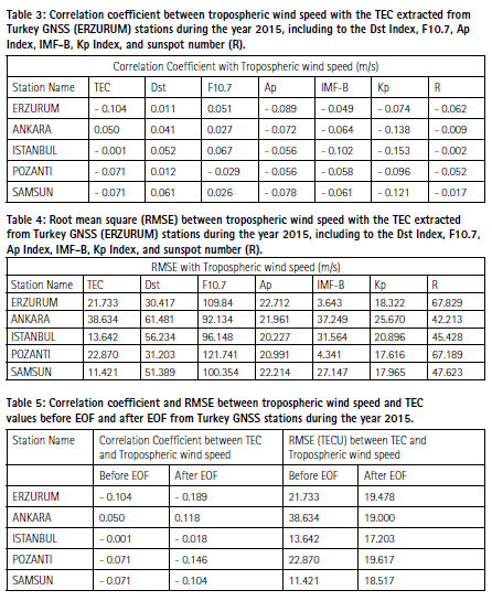 We used the EOF method and predicted TEC at all selected Turkey stations by using observed TEC and three basic geomagnetic indices (F10.7, Dst, and Ap). It means EOF TEC is a function of TEC, F10.7, Dst, and Ap. To analyze the relation between modeled TEC and tropospheric wind speed, the correlation coefficient, and RMSE at noon of each station have been estimated as shown in Table 5. It is clear from the Table that the correlation after applying EOF is less than or equivalent to 0.10 which means they have no relationship or very negligible effect of tropospheric wind speed on EOF TEC. The RMSE for EOF is also very high which again indicates negligible relation of EOF TEC with tropospheric wind speed. There is a little bit of change before EOF (observed TEC) and after the implication of EOF, but not obtained results do provide any significant information. Since tropospheric wind speed does not have any kind of relationship with observed TEC and other geomagnetic indices, hence the same kind of negligible relationship was expected with EOF TEC, because EOF TEC is a function of TEC and geomagnetic indices.