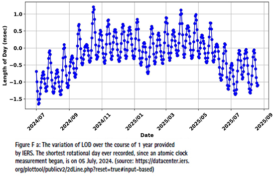 In recent months, particularly during July and August 2025, scientific community observed unusually short days, with August 5 standing out as one of the shortest ever recorded, nearly 1.25 milliseconds shorter than the standard 86,400 seconds. This sparked widespread interest and speculation online about whether the Earth is “speeding up” (Space et.al, 2025). Such variations in the Length of Day (LOD) are not uncommon and result from complex geophysical processes including atmospheric circulation, ocean tides, glacial rebound, and even interactions within the Earth’s core. LOD quantifies the daily deviation in Earth’s rotation speed from the nominal solar day and is a key component of the Earth Orientation Parameters (EOPs). The International Earth Rotation and Reference Systems Service (IERS) is the global authority responsible for monitoring and publishing data related to the Earth’s rotation, reference frames, and timekeeping standards. Using the data from IERS, the yearly variation including 2024 and 2025 looks as shown in Figure F a. There is a clear trend of a shorter length of day to longer length of day to shorter length of day. In last months of July and August, the length of day is indeed shortening. In this plot, the negative value means the shorter length of day (by the msec indicated in the y-axis) than standard SI unit of 86400 seconds.