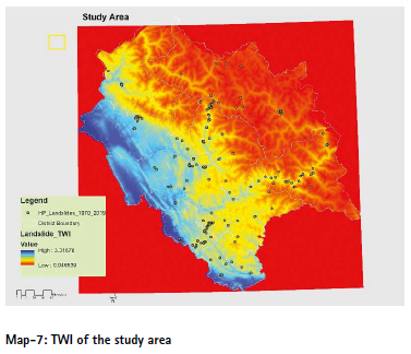 5. Topographic Wetness Index (TWI): TWI is an indicator of soil moisture accumulation. High TWI values point to areas where water naturally converges, making the ground oversaturated and vulnerable to failure.