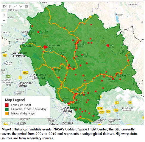 Himachal Pradesh has a long history of recurring landslides, occurring almost every monsoon season. One scientific record of these events is the Global Landslide Catalog (GLC), developed by NASA’s Goddard Space Flight Center. The GLC systematically documents rainfall triggered landslide events worldwide, regardless of their size, location, or impact, drawing on sources such as media reports, disaster databases, scientific studies, and other reliable records. Compiled since 2007 and covering the period from 2007 to 2019, the dataset provides a unique global baseline of landslide occurrences. Analysis of the data demonstrates that a significant number of landslides in Himachal Pradesh occur along major highways and transport corridors, highlighting the vulnerability of critical infrastructure to rainfall-induced hazards.