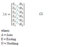The last phase is the area calculation that involves the adjusted coordinates obtained from the 2D Network Adjustment to compute the area of cadaster lots. These methods are also known as the Double Meridian Distance (DMD) methods that are used by the JUPEM as shown in equation 2.