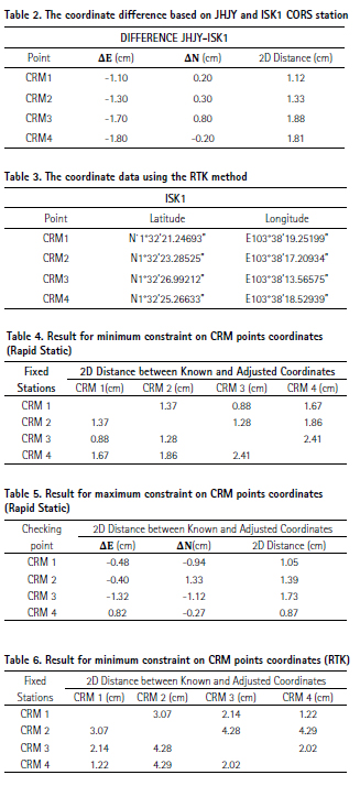 Based on Table 2, all the differences are generally small, with the maximum 2D distance difference is 1.88cm for CRM3. All CRM is below the acceptable range at 3 cm. The final coordinate used is from the average value from JHJY and ISK1. Table 3 shows the data for RTK that have been surveyed to four CRM points. RTK provides users with the coordinates only without a proper checking procedure. Further research can be done to propose a checking procedure for the establishment CRM using RTK.