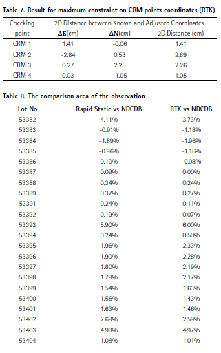 Based on Table 5, the highest value for checking point using Rapid Static is CRM 3 which are 0.017 m. Meanwhile, in Table 7, the highest value for checking point using RTK is CRM 2 which are 0.029m. CRM 1, CRM 2, CRM 3 are used for maximum constraint. The 2D difference for this set is the lowest because its value is within the acceptance tolerance of 3 cm. The final coordinates of CRM are used in a Least Square Adjustment to determine the final coordinate of all the boundary points allowing to make area calculation. 2D Adjustment using Rapid Static performed better than RTK. This is because Rapid Static involves a longer observation time, which introduces measurement redundancy and allows for more accurate modeling of environmental factors, such as atmospheric delays and signal multipath effects, leading to improved baseline processing.