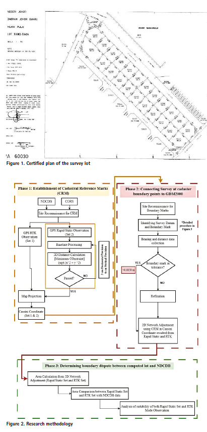 In this research, two types of data were utilized. The first data comprises cadastral survey data, which consists of instrumentation calibration data, solar observations data, traversing data, and refixation data. The second data involves GNSS measurement; RTK and Rapid Static observation conducted over 30 minutes. These GNSS measurements are subsequently compared with the NDCDB provided by Department of Survey and Mapping Malaysia (Jabatan Ukur dan Pemetaan, JUPEM). Following data collection, the results are visualized using AutoCAD software to analyze the impact of both GNSS measurement methods and the NDCDB.