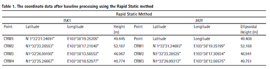 The coordinate for CRM1, CRM2, CRM3, and CRM4 in GDM2000 is shown in Table 1. The result in Table 1 shows the coordinates in latitude, longitude, and ellipsoidal height. Table 2 below describes the difference in the coordinates based on two CORS stations, which are JHJY from MyRTKnet and ISK1 from NRCnet. The coordinate is compared in difference northing (ΔN), easting (ΔE), and 2D distance.